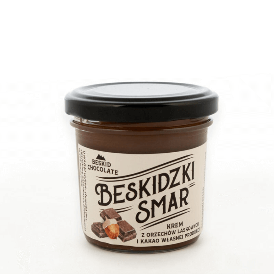 Beskidzki Smar to rzemieślniczy krem z orzechów laskowych i kakao, tworzony w manufakturze Beskid Chocolate z dbałością o najwyższą jakość składników. Powstaje na bazie starannie wyselekcjonowanych surowców oraz kakao produkowanego metodą „od ziarna do tabliczki”, pochodzącego z aromatycznych odmian ziaren kakaowca. Krem wyróżnia się intensywnym, głębokim smakiem kakao, naturalną słodyczą oraz wyraźną nutą orzechów laskowych.