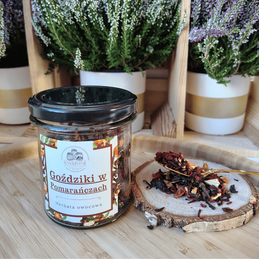 Goździki w Pomarańczach to aromatyczna mieszanka owocowa, która łączy w sobie rozgrzewające nuty korzenne z cytrusową świeżością. Zamknięta w eleganckim słoiku, zachwyca nie tylko smakiem, ale i wyglądem – idealna na chłodne wieczory, jako dodatek do domowego relaksu lub prezent dla miłośnika herbat.