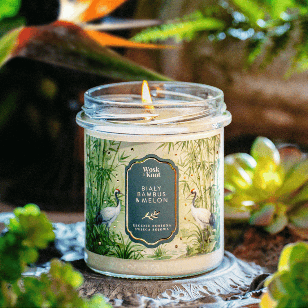 Świeca sojowa Biały Bambus & Melon od Wosk i Knot tworzy atmosferę świeżego poranka w nowoczesnym, pełnym światła ogrodzie. Jej aromat jest lekki, przejrzysty i nasycony zieloną energią, łącząc wodną świeżość z delikatną owocową miękkością i eleganckim, harmonijnym wykończeniem.
